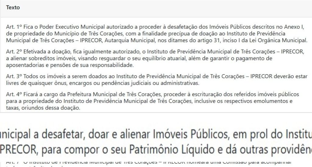 Em 2017, houve nova tentativa, agora com outra finalidade, socorrer o Fundo de Previdencia do Municipio, IPRECOR, que estava deficitário. A proposta era DOAR BENS PÚBLICOS EM FAVOR FORMAR CAIXA EM SOCORRO AO IPRECOR. (O Projeto visava “Autoriza o Poder Executivo Municipal a desafetar, doar e alienar Imóveis Públicos, em prol do Instituto de Previdência Municipal de Três Corações – IPRECOR, para compor o seu Patrimônio Líquido e dá outras providências”. Más, saiu DERROTADO, por 5 x 4. Na época, votaram CONTRA o projeto do prefeito (Jorge Machado, Williandro, Eder da TNT, Ricardinho e Werbinho) e a FAVOR do prefeito (Helder da Fonseca Reis, Francisco Carlos Pinheiro, Juliana Prudêncio e Fabiano Barbosa). E o Projeto foi RETIRADO, REJEITADO, VETADO E ARQUIVADO, em 28/08/2017.